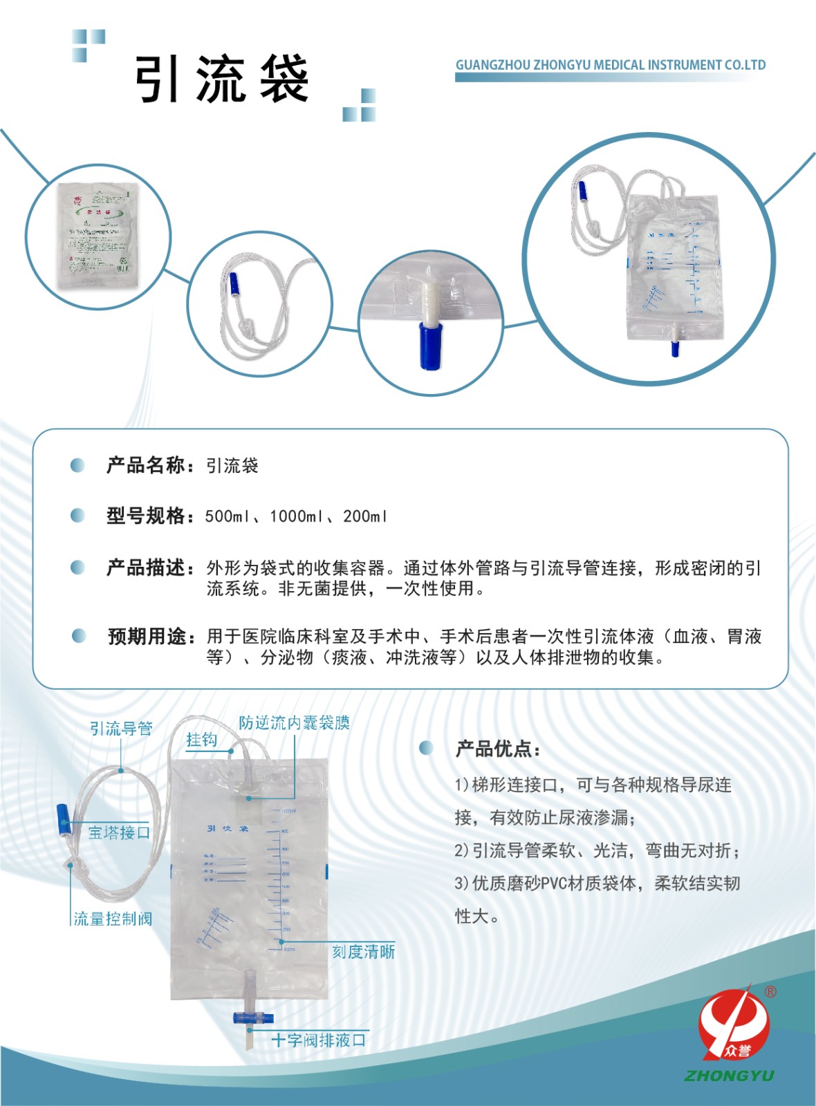 產(chǎn)品描述:外形為袋式的收集容器。通過體外管路與引流導(dǎo)管連接,形成密閉的引流系統(tǒng)。非無菌提供,一次性使用。用于醫(yī)院臨床科室及手術(shù)中、手術(shù)后患者一次性引流體液(血液、胃液等)、分泌物(痰液、沖洗液等)以及人體排泄物的收集。